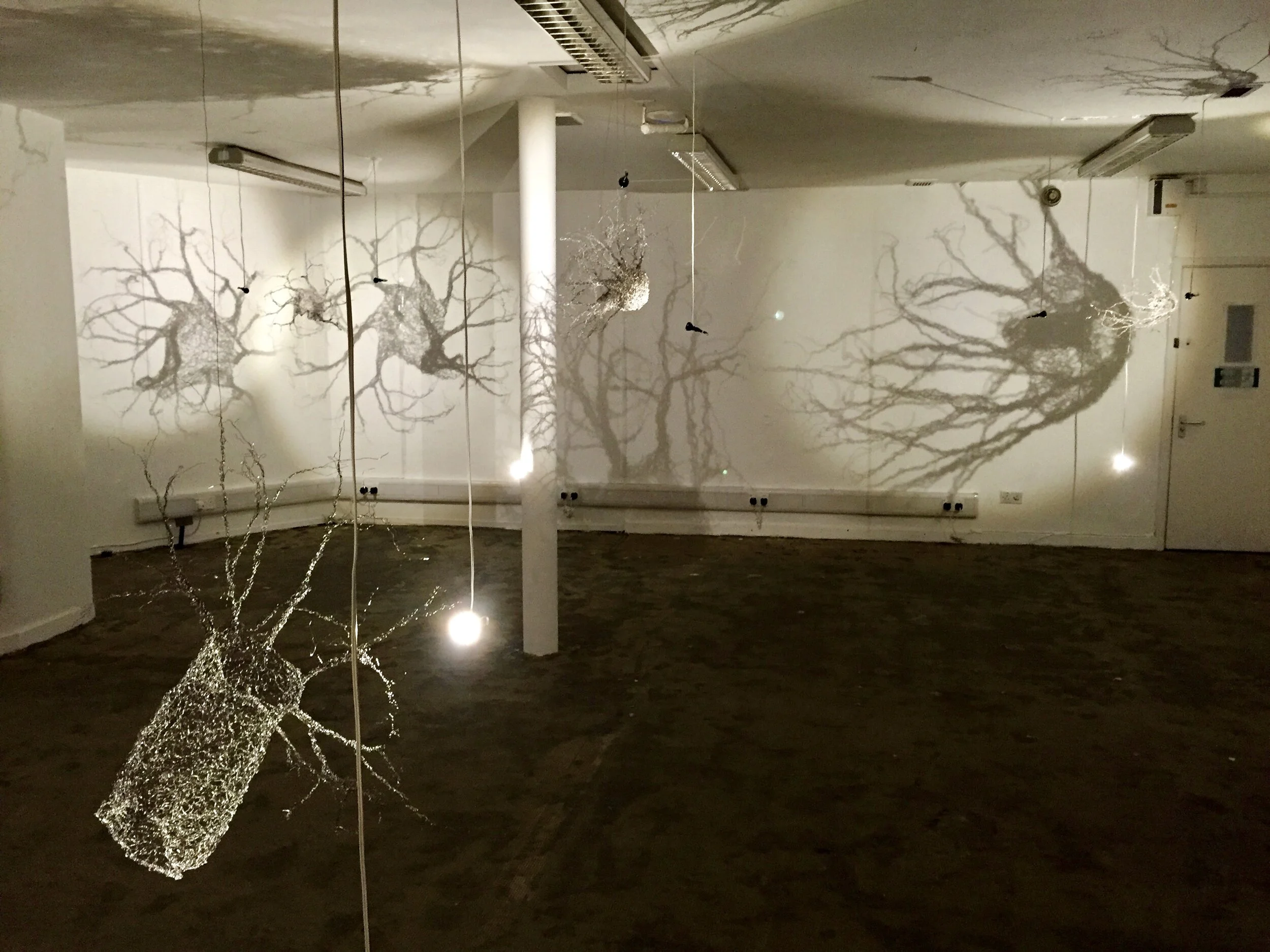 Resonating capacities long gone, some old wooden piano key hammers and an assortment of other randomly chosen objects find themselves trapped inside bits of basketwork. A red plastic wire bleeds onto the floor. Objects are snared in fastidiously fabricated wire cages. Closer observation shows that each of the dangling hundred or so spiky structures is meticulously constructed to resemble a human throat. From each gullet, a tiny wooden bead of a mouth spews out a profusion of wire, cartoon-style, like a mini-volcanic eruption of noise. This dis-abled chorus of objects is accompanied by an intermittent audio track: an old metal boiler casing mounted with decoy speakers conceals a throbbing mash-up of human voices muttering ‘Let me know when you want releasing…’ 2 Every so often, tucked away in a corner, a looped animation is projected onto the wall; a fleshy mouth bares its teeth, barking like an angry dog.