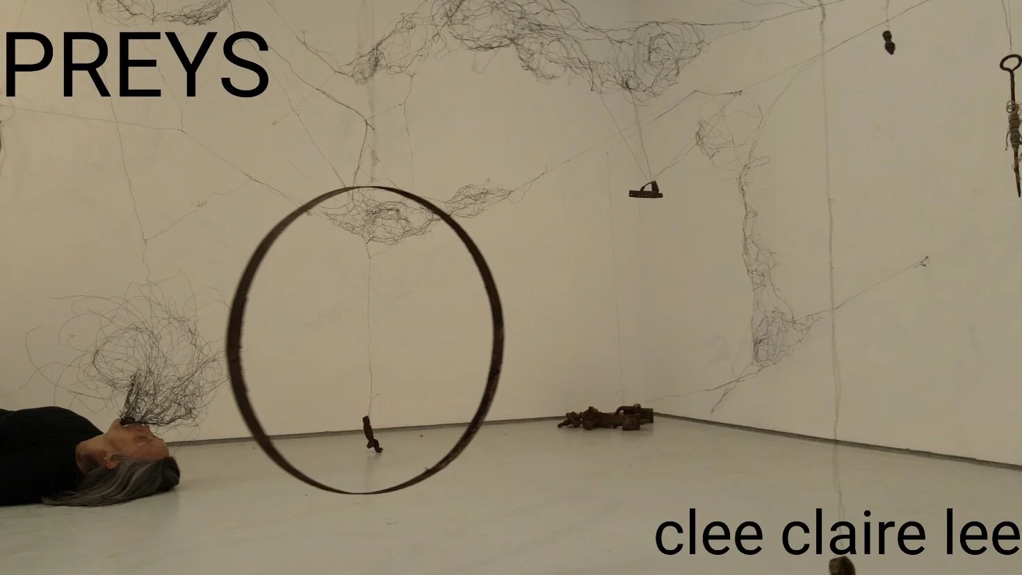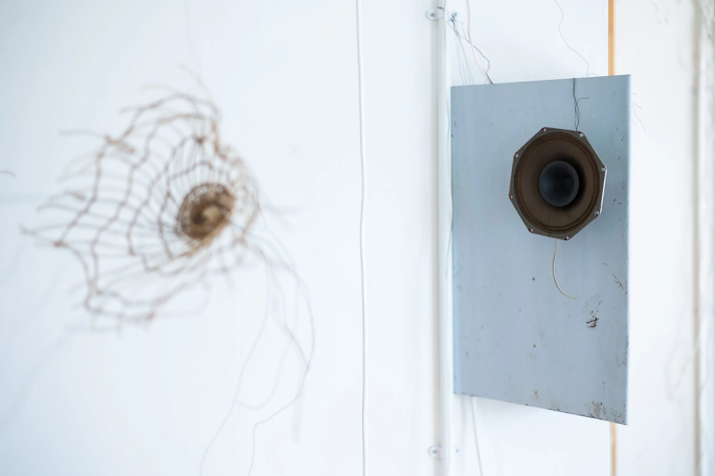 Before addressing the silencing and noisy resonances of the work, the materials and processes involved in the artist’s practice deserve some prior attention. Although this is a solo exhibition, much of Lee’s work emerges from a lengthy gestation of working through ideas collectively with other practitioners: visual artists, dancers and film-makers 4. That said, the modular structures in Preys B were created through an intense laborious process which was solitary and involved many hours of close detailed work. Largely using a twining technique, rather than weaving, sometimes in combination with raffia, the web-like fabrications, forming Forty days, one mile, a hundred voices, were primarily made from a mile-long length of ‘paper string’ originally sourced from Japan. Shifu is the name given to the making of thread or string from washi, a Japanese handmade paper traditionally made from kozo (mulberry). For over 1,500 years, and with only a few refinements, traditional papermaking methods produced strong paper. This paper was spun into thread and the thread was then woven into shifu cloth used to make durable everyday garments. With the development of synthetic fibres, this ancient craft had almost disappeared during the first half of the 20th century but with the demand for sustainable materials and a resurgence of interest in artisanship, there has been a contemporary revival of the art of shifu 5. The paper string used in Lee’s installation is made from recycled paper. Another sustainable aspect of the installation, and indeed of the artist’s practice more generally, is the re-use of materials. Frequently, Lee’s installations re-deploy salvaged objects and dismantled things that she had previously fabricated, sometimes the result of collaborations with other artists. In this way, items such as a cherished chair castor, or the tiny galvanised mesh wire cage that was previously part of a collaborative piece in Material Voice’s Matter out of Place 6, form an ongoing conversation in which objects speak to each other.
